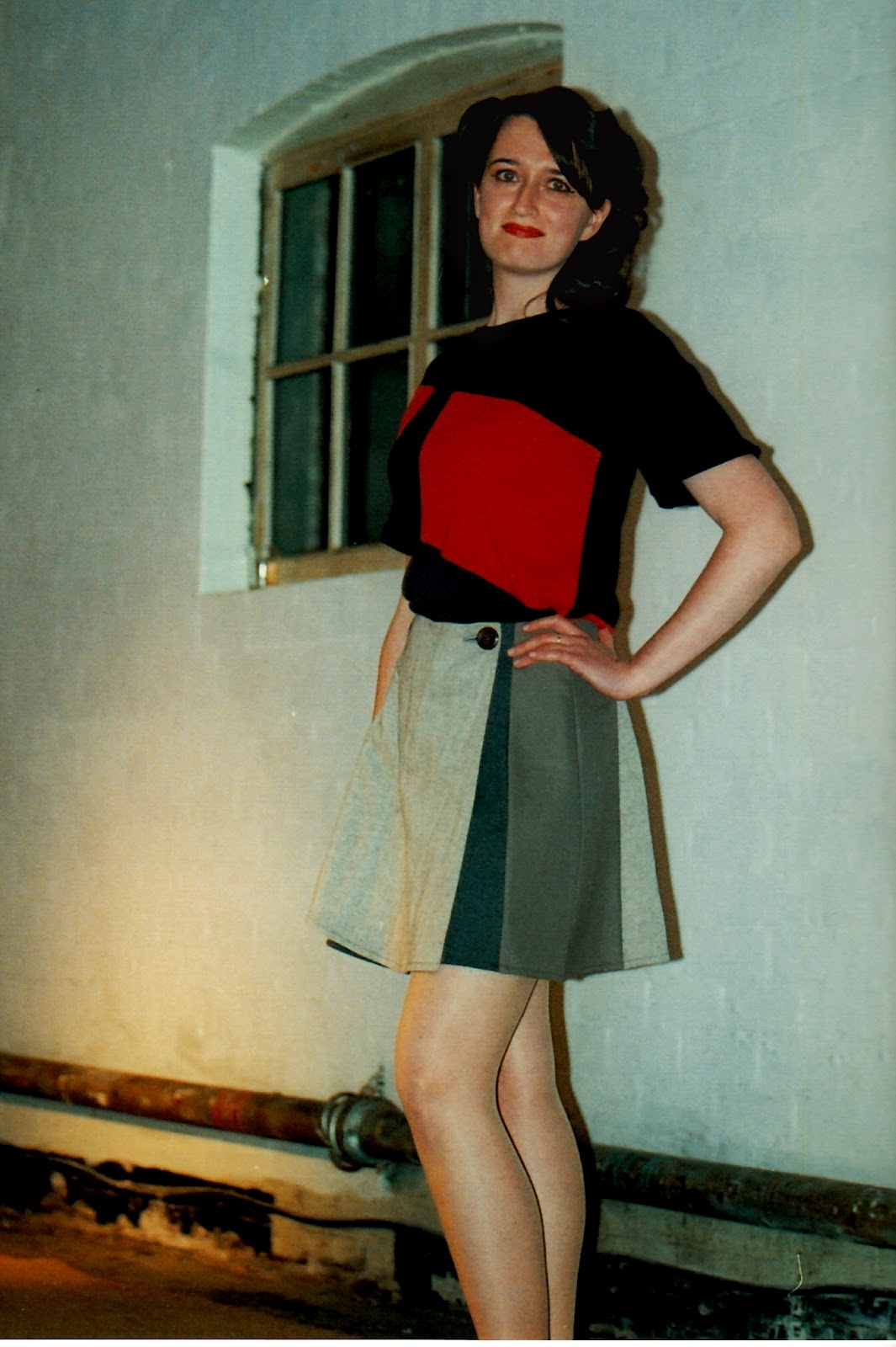 Sam wears blouse upcycled from a man's shirt, with new collar and handmade arrow skirt in wool tweed.